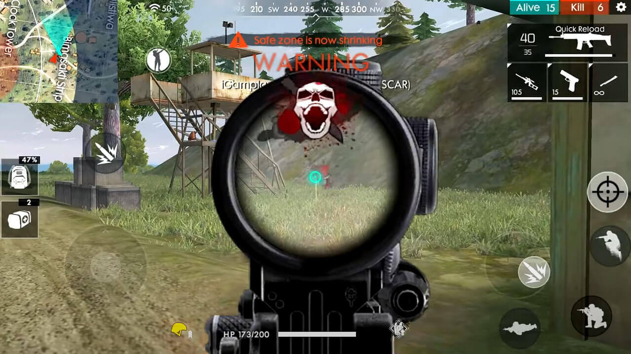 When it comes to the gameplay, the game offers fast-paced battle-royale style gameplay where you, along with 49 other players, will be left on a remote island, and whoever remains the last man standing wins the game. The game uses on-screen controls that are really easy to get a hold of and, there’s even an option for you to set your controls as you please. You’ll land on your preferred spot on the island and once you’re down there, it’s all about surviving. You’ll explore the map for guns, medical kits, attachments, and tons of other stuff.